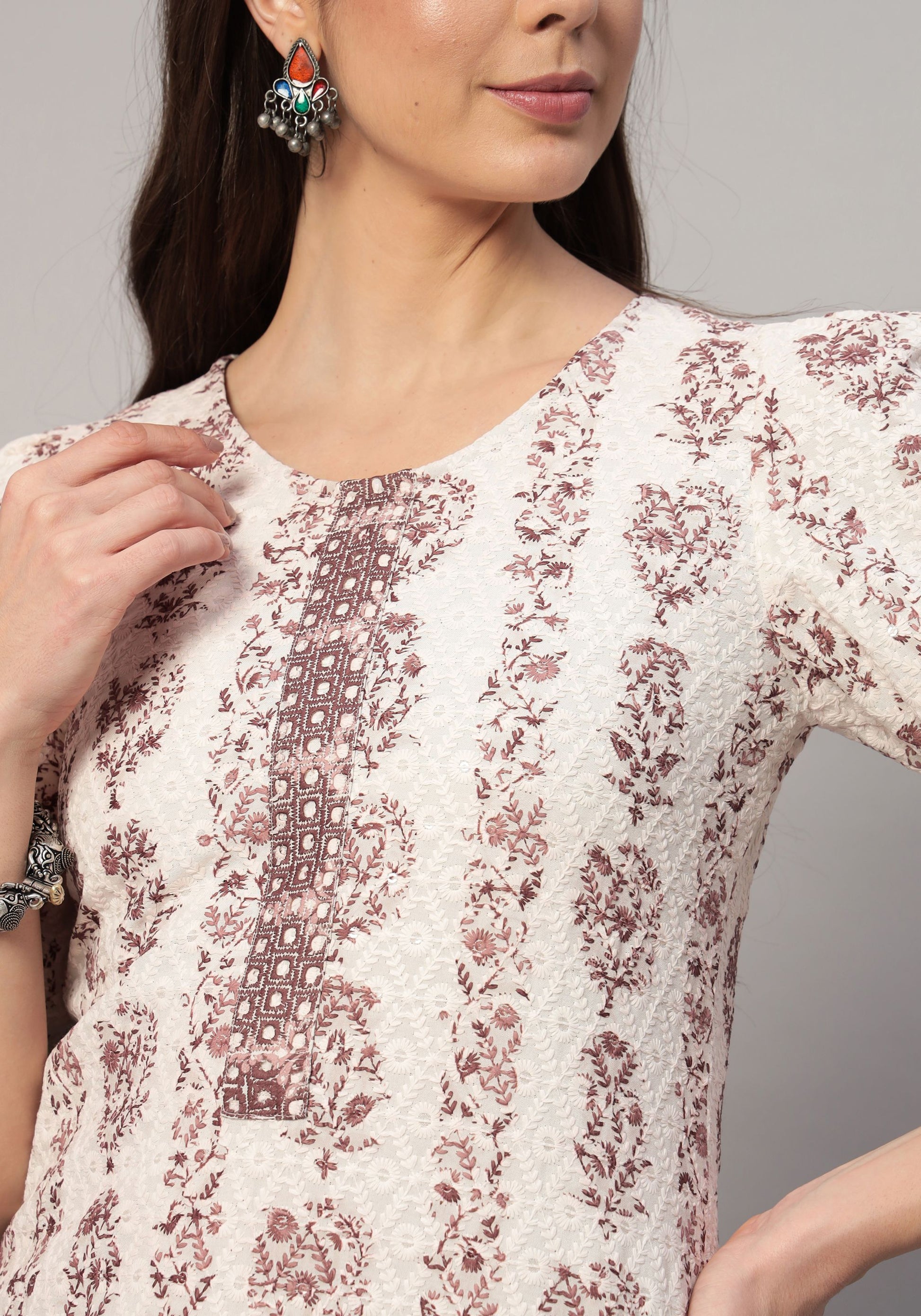 Elevate your ethnic wardrobe with this stunning printed suit, designed to make a statement. The knee-length kurta features exquisite embroidery, a flattering straight shape, and a comfortable round neck, complemented by elegant 3/4 sleeves. Paired with solid dhoti pants that offer a slip-on closure and an elasticated waistband for ease of wear, this ensemble ensures both style and comfort. The included solid dupatta, adorned with a plain border and delicate lace ornamentation, adds a touch of sophistication. Perfect for festive occasions or casual gatherings, this suit is a must-have for the modern woman who values elegance and grace.
