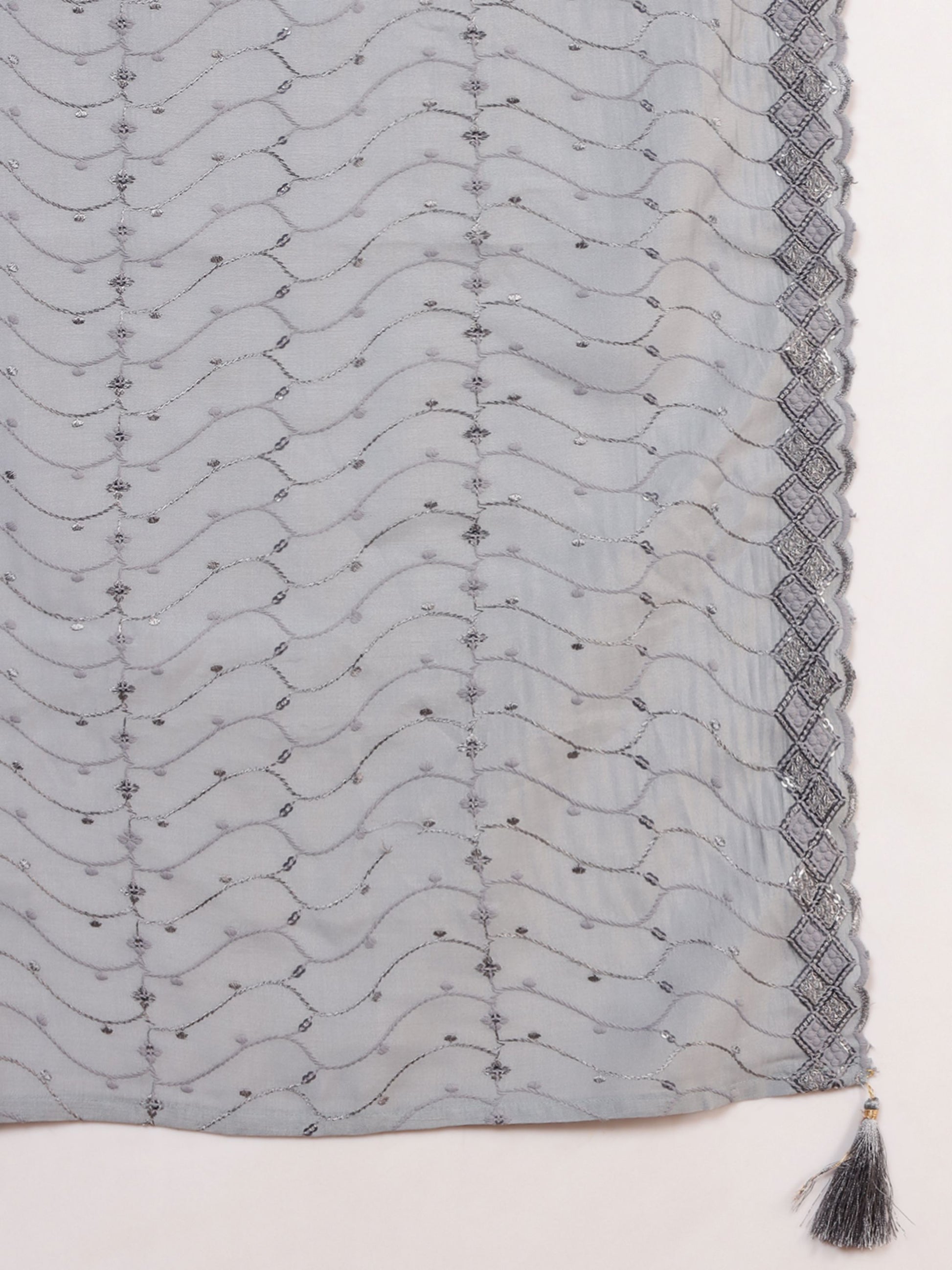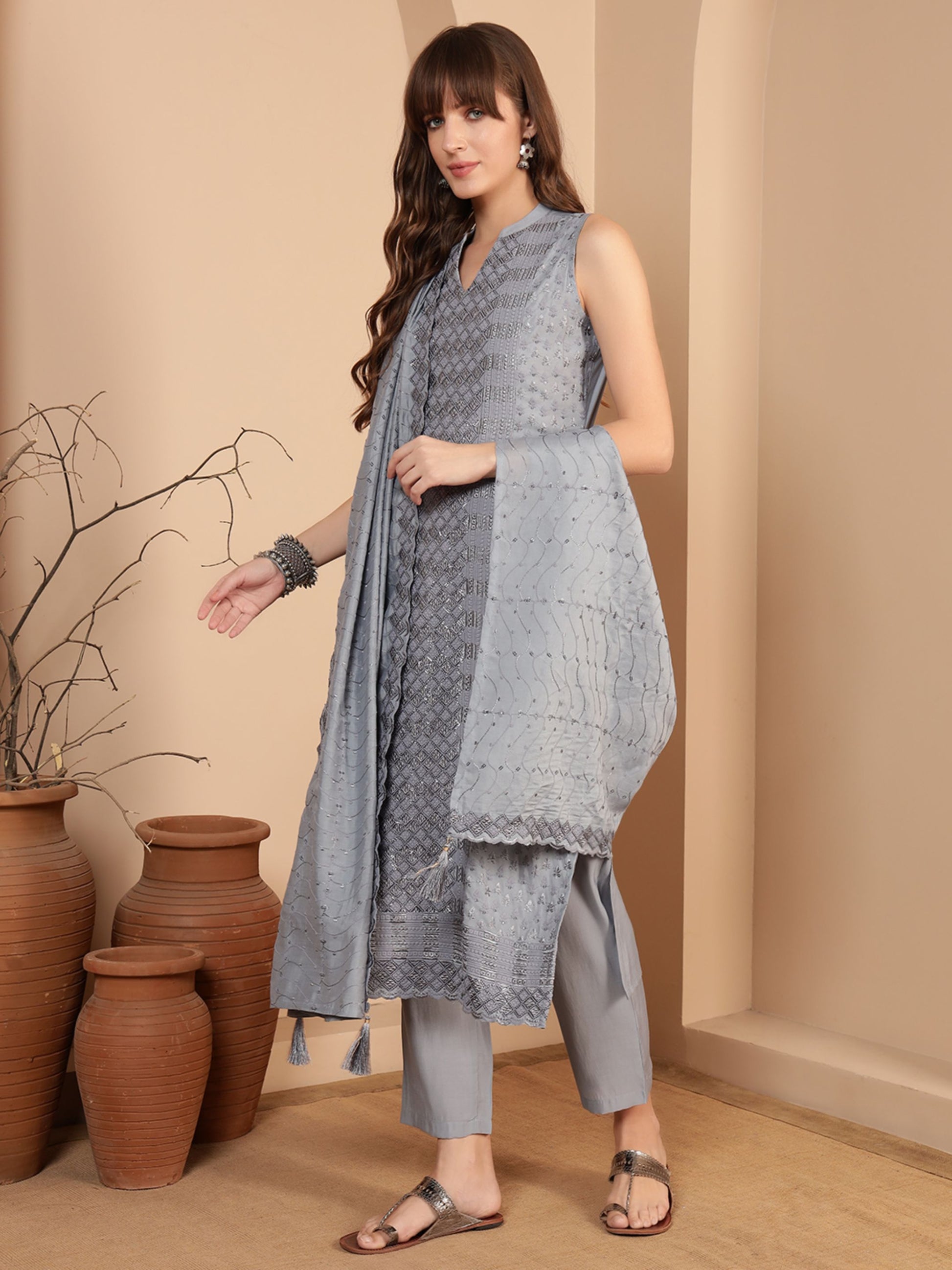 Cloud Grey Embroidered Silk Blend Women's Kurta, Pyjama & Dupatta Set