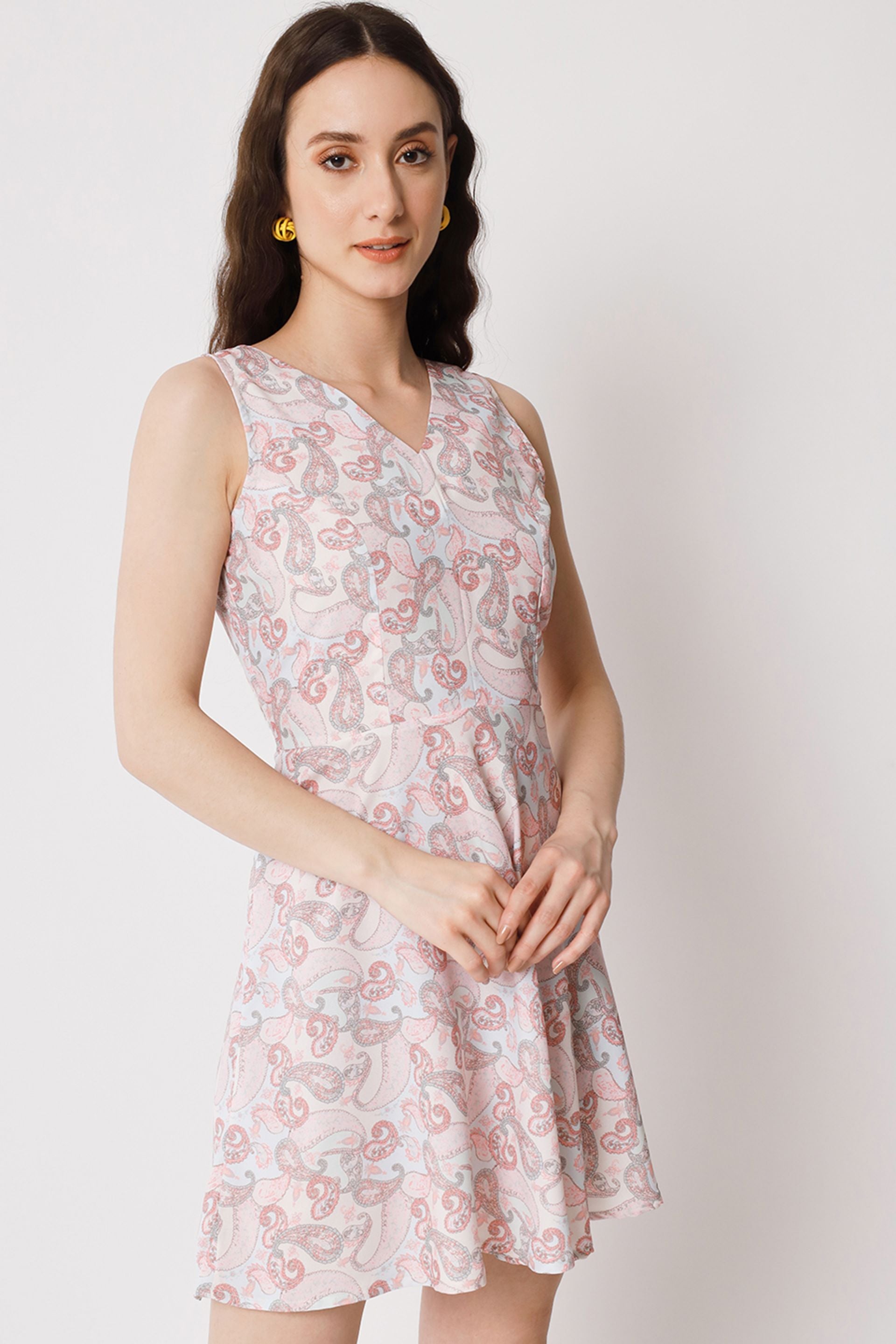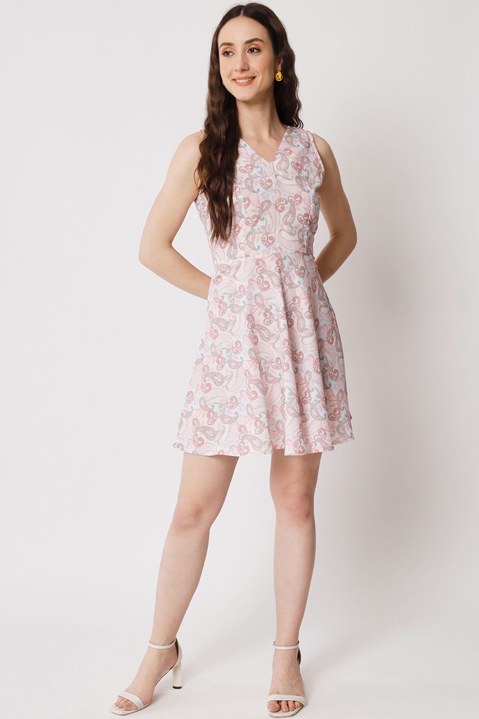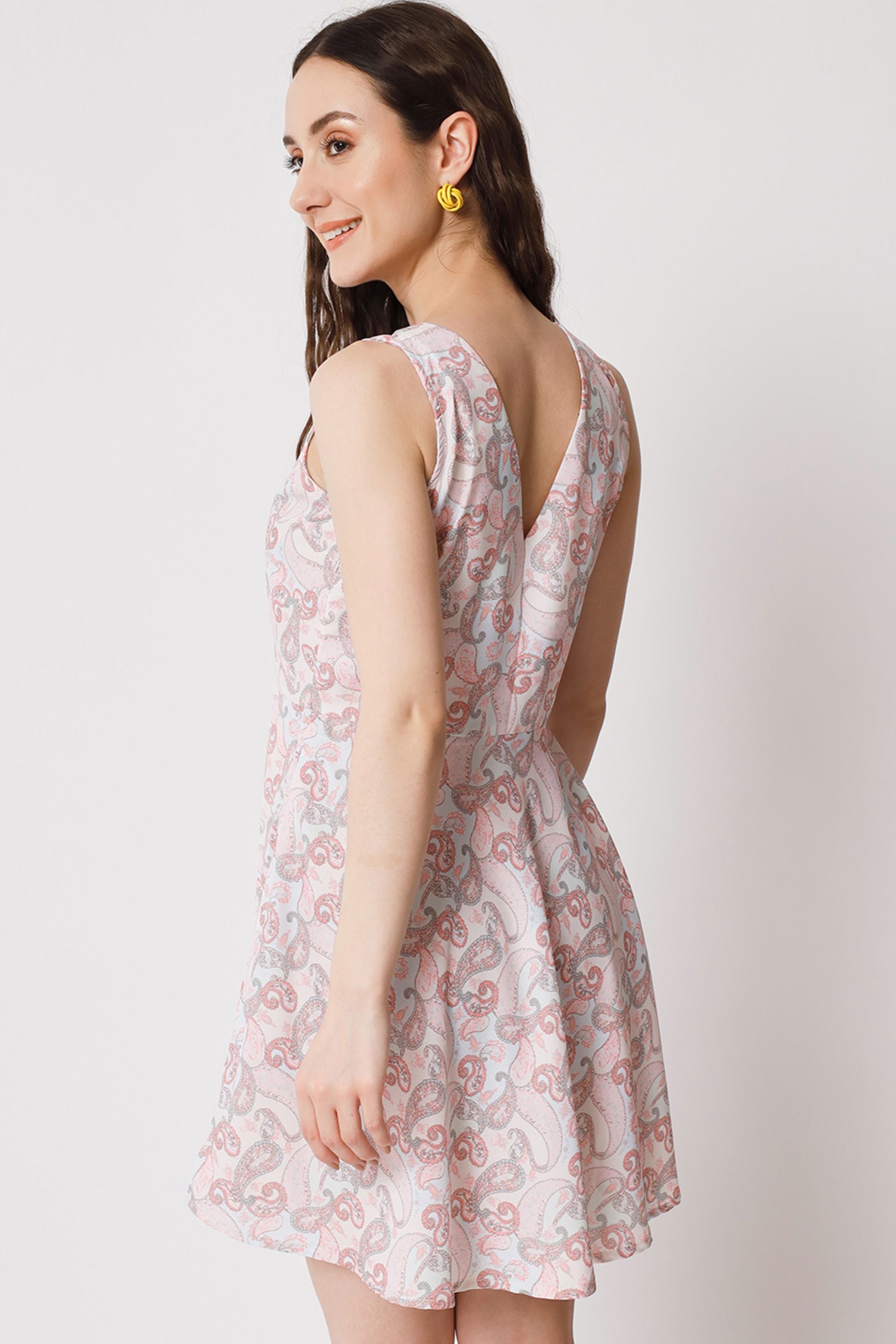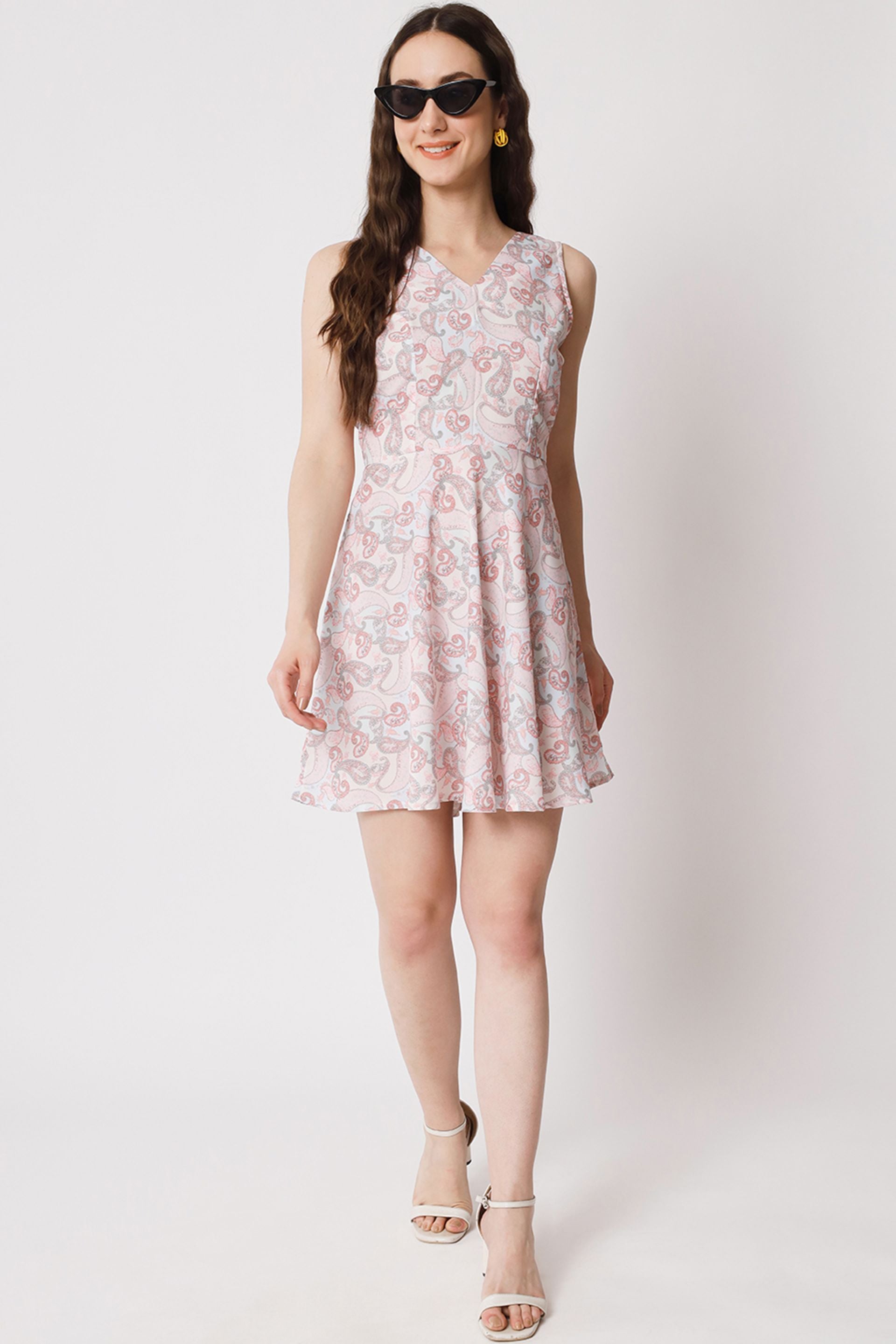 Elevate your wardrobe with our stunning floral skater dress, designed to make a statement at any occasion. this mini thigh-length dress features a flattering flared shape and a chic V-neckline, perfect for showcasing your favorite accessories. the sleeveless design ensures comfort and breathability, while the vibrant floral print adds a touch of femininity and charm. whether you're heading to a summer garden party or a casual brunch, this dress is the ideal choice for effortless style and elegance.
