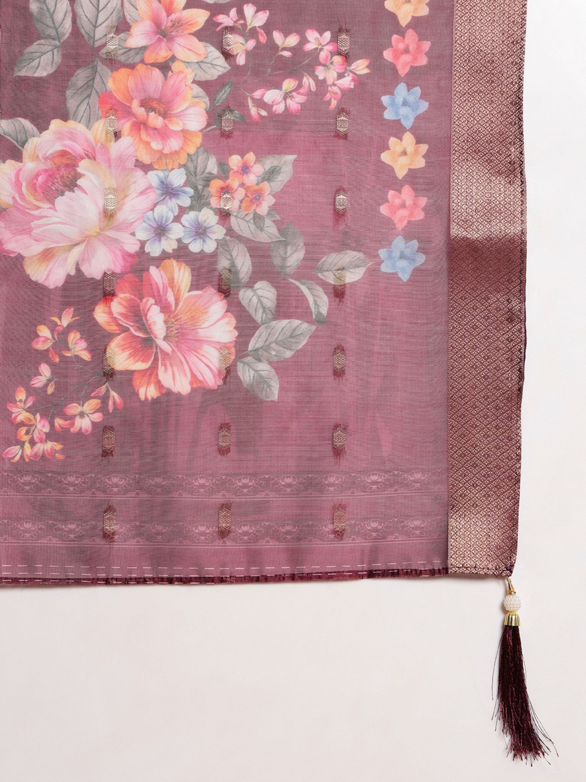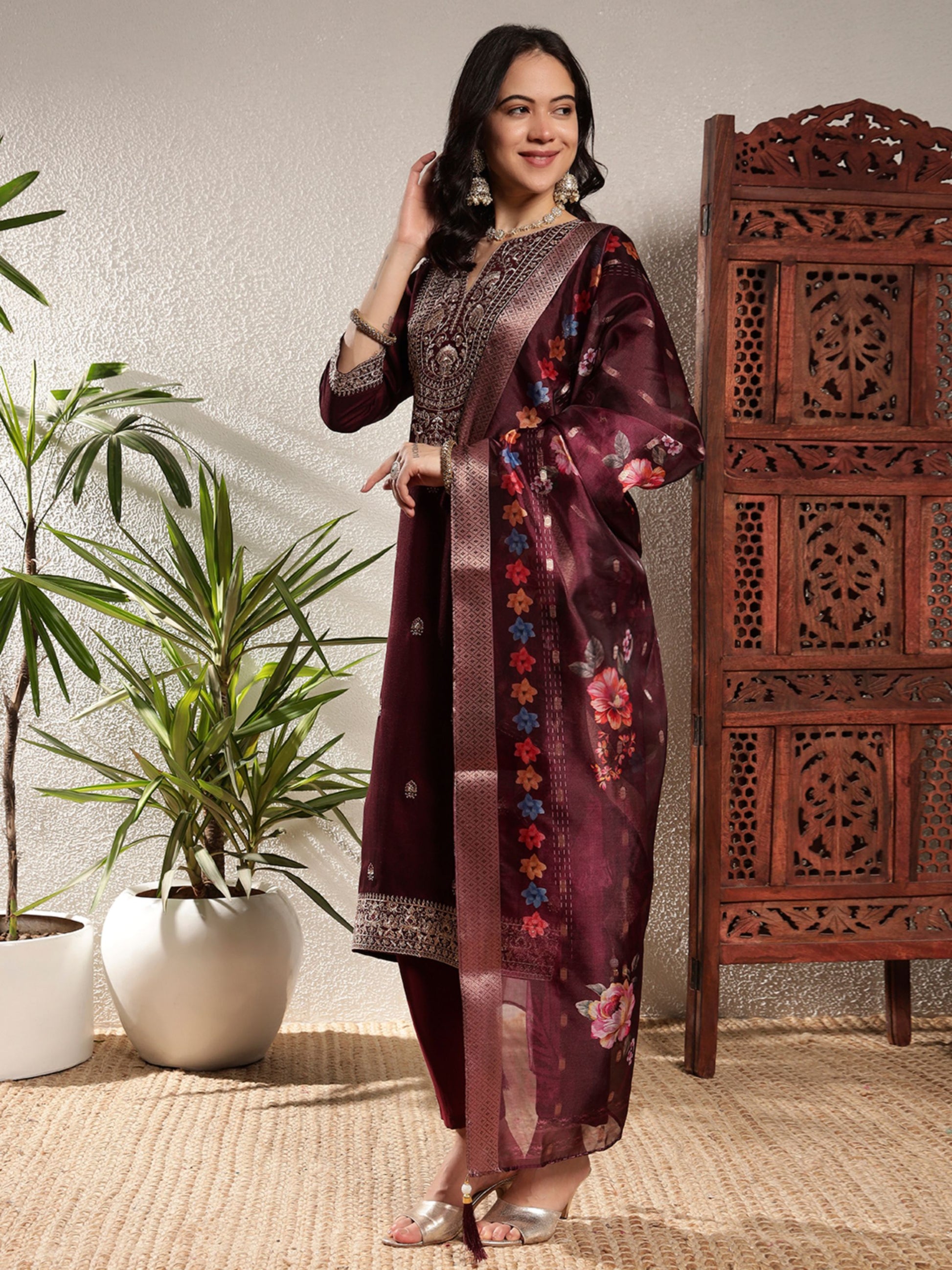 Dark Maroon Embroidered Silk Women's Kurta, Pyjama & Dupatta Set