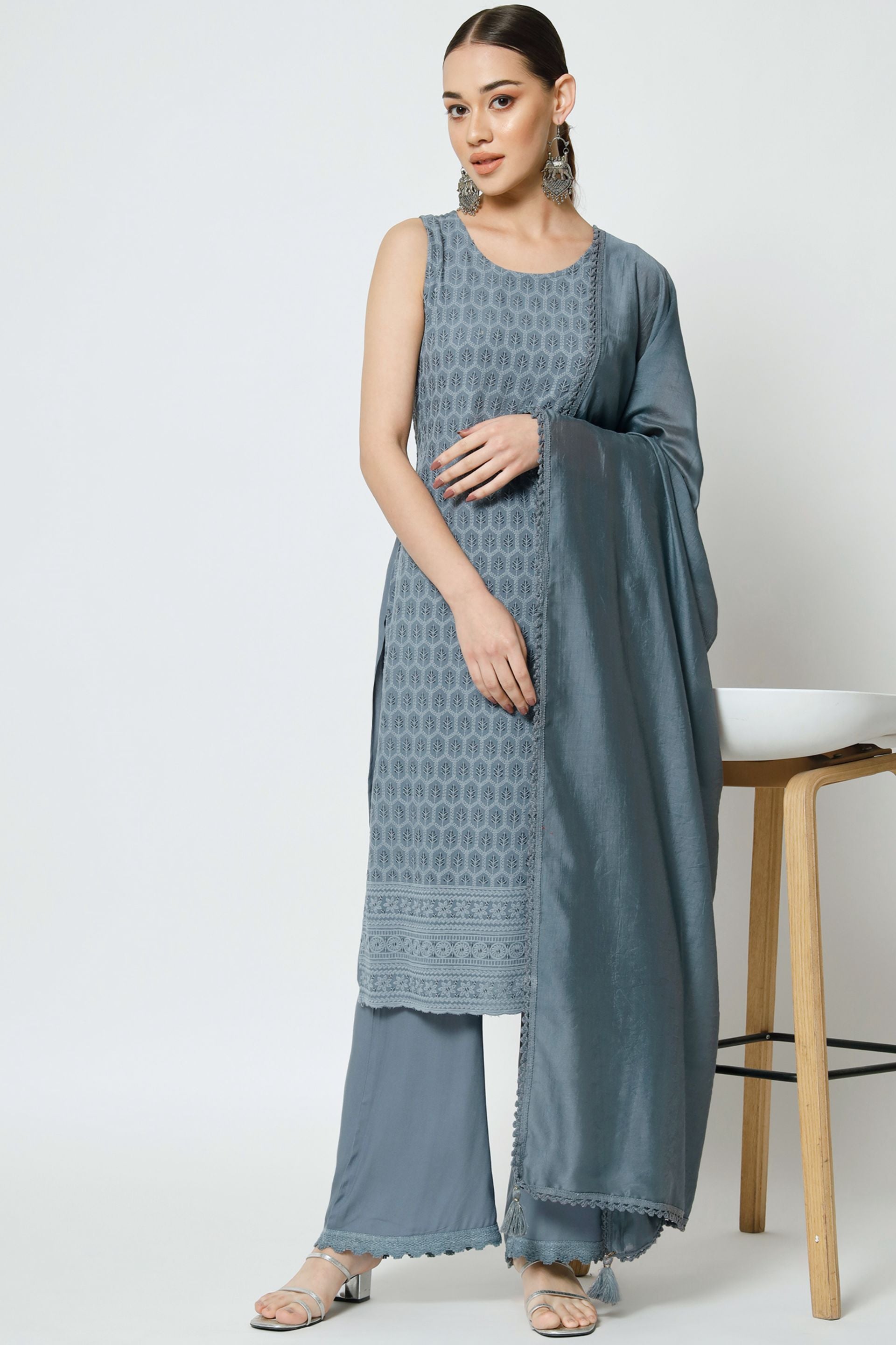 Elevate your ethnic wardrobe with this stunning embroidered suit, featuring a beautifully crafted calf-length kurta adorned with intricate embroidery and sequined details. The straight silhouette and round neck design offer a flattering fit, while the sleeveless style adds a touch of modern elegance. Paired with solid palazzo pants that boast an elasticated waistband for ultimate comfort, this ensemble is perfect for any festive occasion. Complete your look with the included solid dupatta, elegantly finished with tassel borders, making it a versatile addition to your collection. Embrace sophistication and style with this exquisite outfit that promises to turn heads wherever you go.