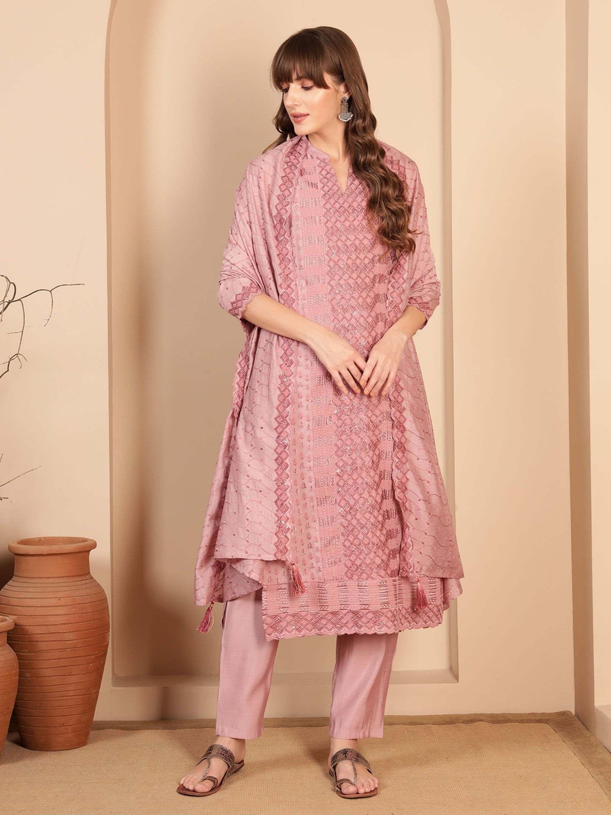Dusty Rose Embroidered Silk Blend Women's Kurta, Pyjama & Dupatta Set