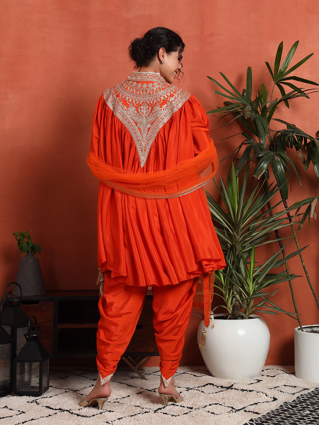 Elevate your ethnic wardrobe with this stunning kurta suit, crafted from soft chinnon fabric for a luxurious feel. The flared kurta features a stylish collar neck, full sleeves, and a flared hemline that adds a touch of elegance to your look. Paired with comfortable dhoti pants that have an elasticated waist, this set ensures you stay chic without compromising on comfort. Complete your ensemble with the matching dupatta adorned with playful tassels, making it perfect for festive occasions or casual outings. Embrace effortless style and make a statement with this beautiful kurta suit!