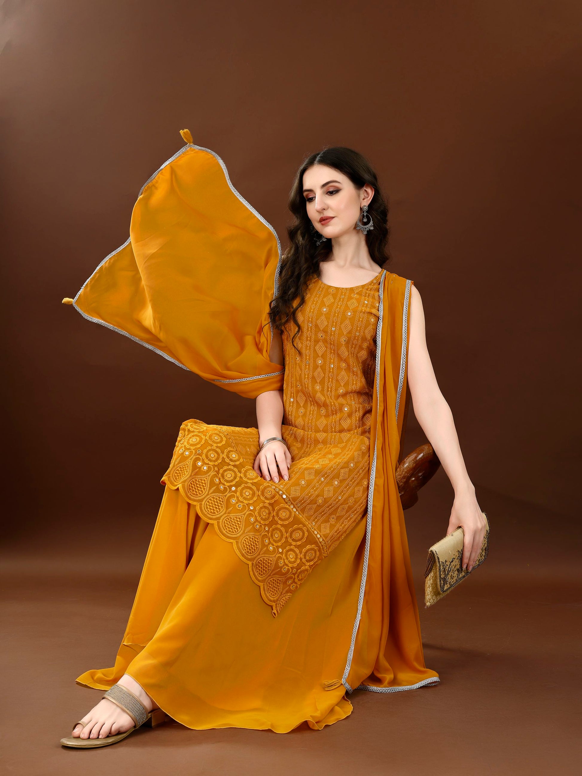 Elevate your ethnic wardrobe with our stunning embroidered Georgette Kurta Set. This exquisite ensemble features a calf-length straight kurta adorned with intricate embroidery and sequinned ornamentation, creating a perfect blend of elegance and style. The sleeveless design and round neck add a modern touch, while the solid palazzo bottoms with an elasticated waistband ensure comfort and ease of wear. Complete your look with the included solid dupatta, beautifully finished with tassels for an added flair. Ideal for festive occasions or casual gatherings, this salwar suit is a must-have for the fashion-forward woman.