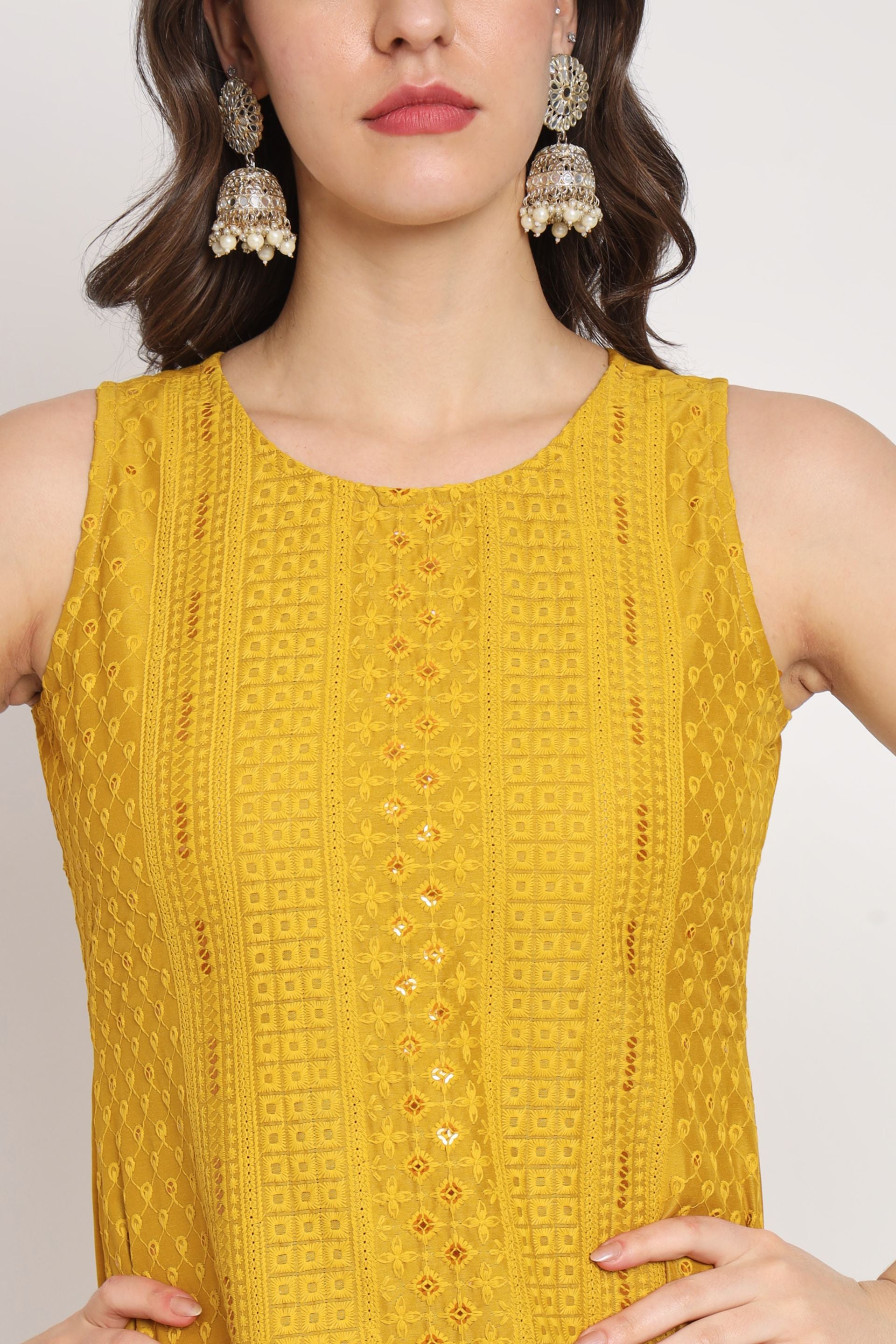 Elevate your party wardrobe with this stunning kurta set, designed to make a lasting impression. The calf-length kurta features exquisite embroidery and a round neck, complemented by sequinned ornamentation that adds a touch of glamour. Its straight shape and sleeveless design ensure a flattering fit, while the solid-patterned pants with an elasticated waistband provide comfort and ease of movement. Complete your look with the included solid dupatta, adorned with stylish tassels, perfect for draping or styling as you desire. This ensemble is not just a choice; it's a statement of elegance and sophistication for any festive occasion.