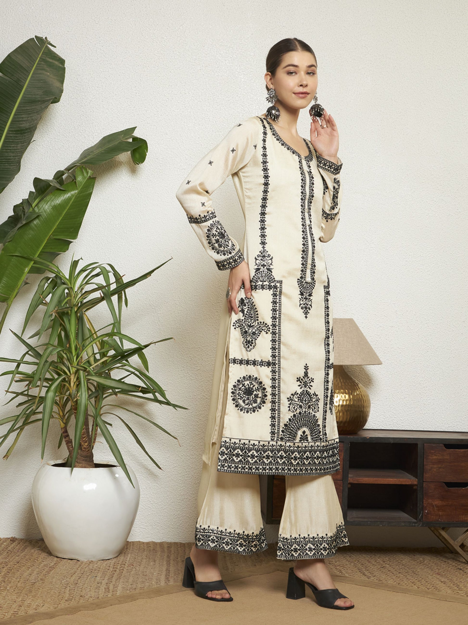 Ivory Embroidered Silk Women's Kurta,Palazzo and Dupatta Set