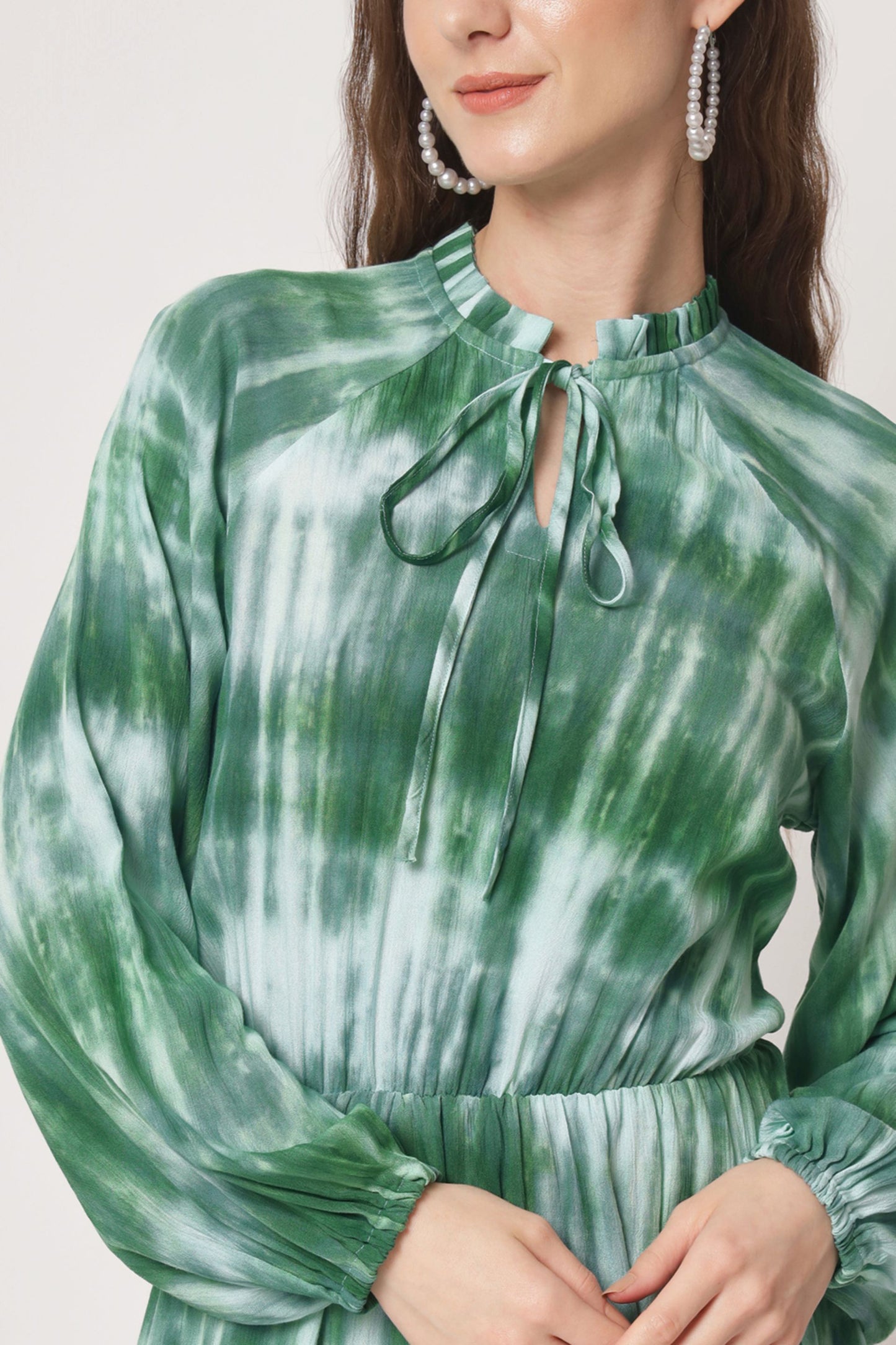 Elevate your wardrobe with our stunning printed dress, designed to make a statement. this knee-length fit and flare dress features a charming tie-up neck and playful puff sleeves, offering a perfect blend of comfort and style. the unique tie-dye pattern adds a touch of artistic flair, making it ideal for both casual outings and special occasions. embrace effortless elegance and versatility with this must-have piece that will surely turn heads wherever you go.