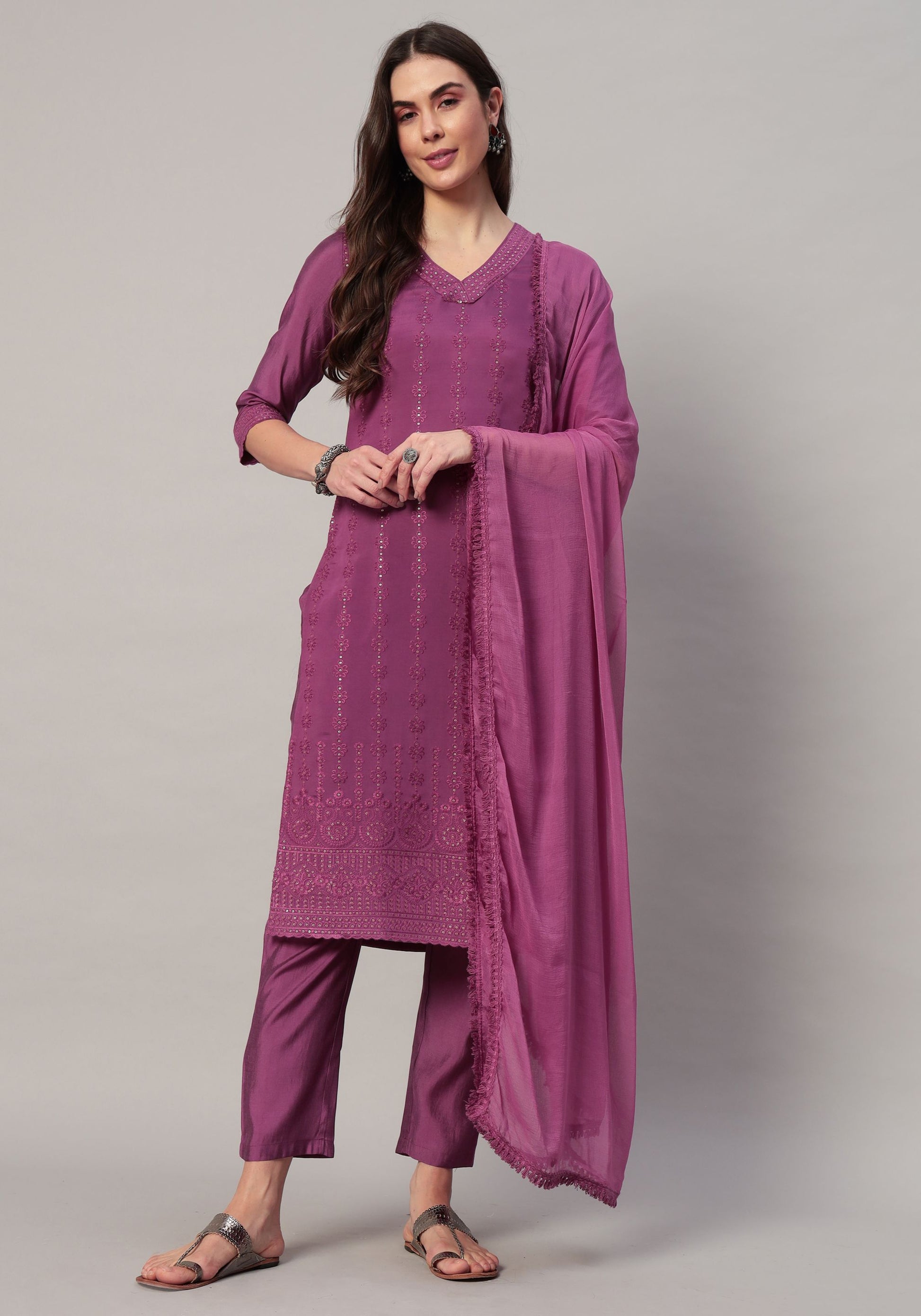 Elevate your casual wardrobe with this stunning kurta suit, designed for effortless style and comfort. The calf-length kurta features intricate embroidery and a chic V-neck, complemented by 3/4 sleeves and sequinned ornamentation that adds a touch of elegance. Paired with solid slip-on pants and an elasticated waistband for a perfect fit, this ensemble is both practical and fashionable. The included solid dupatta, adorned with playful tassels, completes the look, making it an ideal choice for any casual occasion. Embrace a blend of tradition and modernity with this versatile kurta suit.