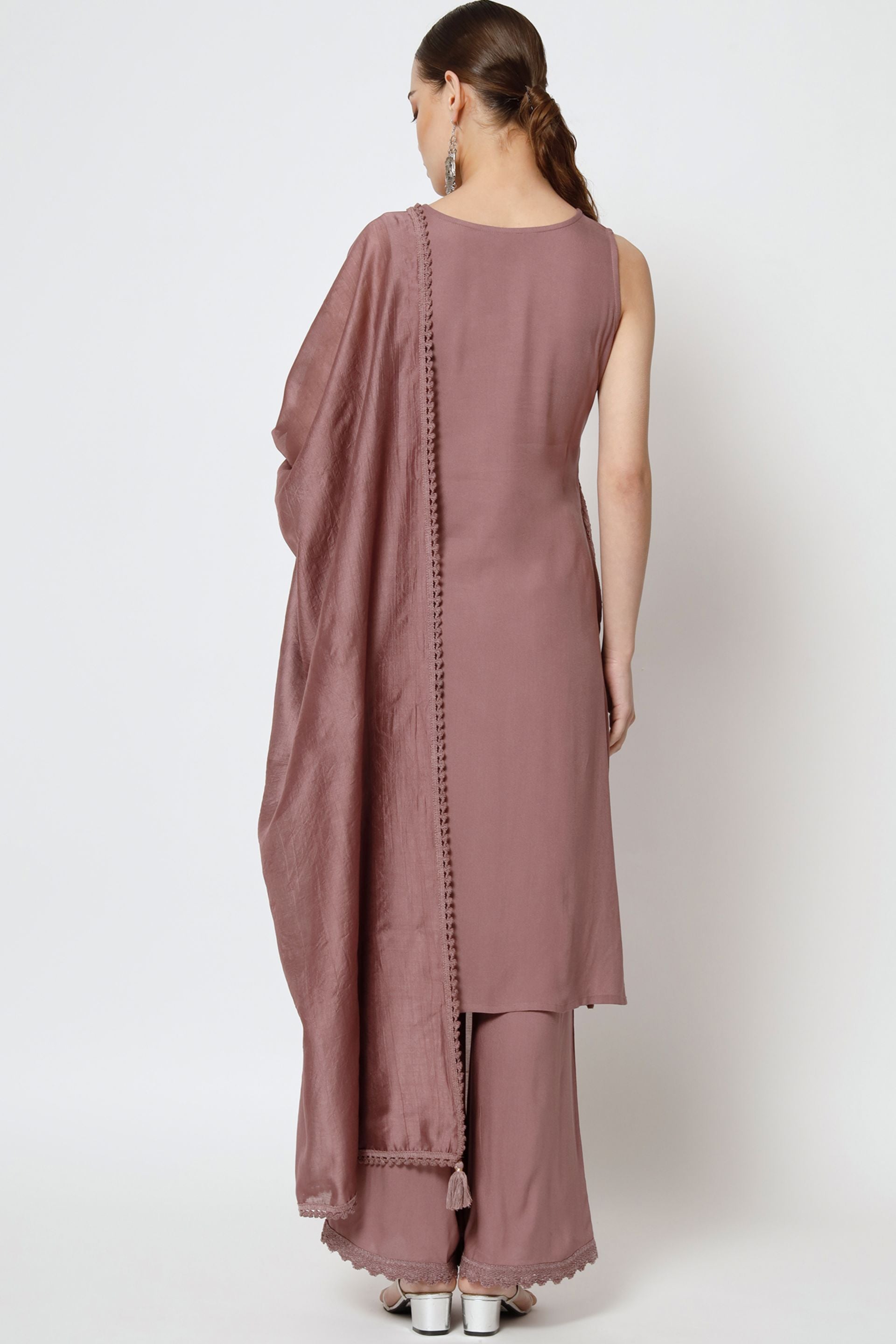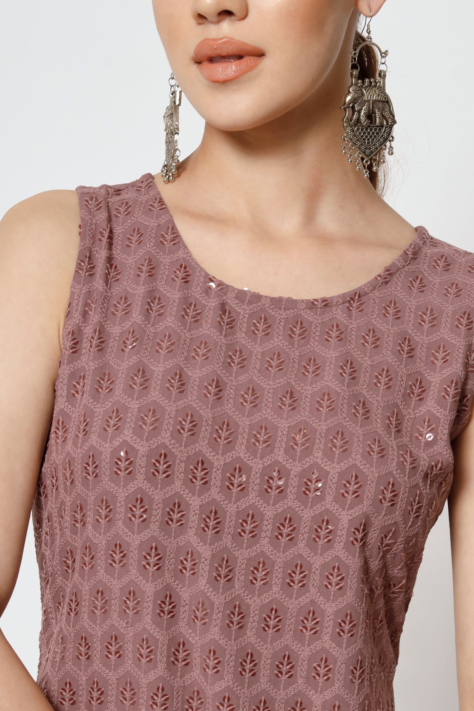 Elevate your ethnic wardrobe with this stunning embroidered suit, featuring a beautifully crafted calf-length kurta adorned with intricate embroidery and sequined details. The straight silhouette and round neck design offer a flattering fit, while the sleeveless style adds a touch of modern elegance. Paired with solid palazzo pants that boast an elasticated waistband for ultimate comfort, this ensemble is perfect for any festive occasion. Complete your look with the included solid dupatta, elegantly finished with tassel borders, making it a versatile addition to your collection. Embrace sophistication and style with this exquisite outfit that promises to turn heads wherever you go.