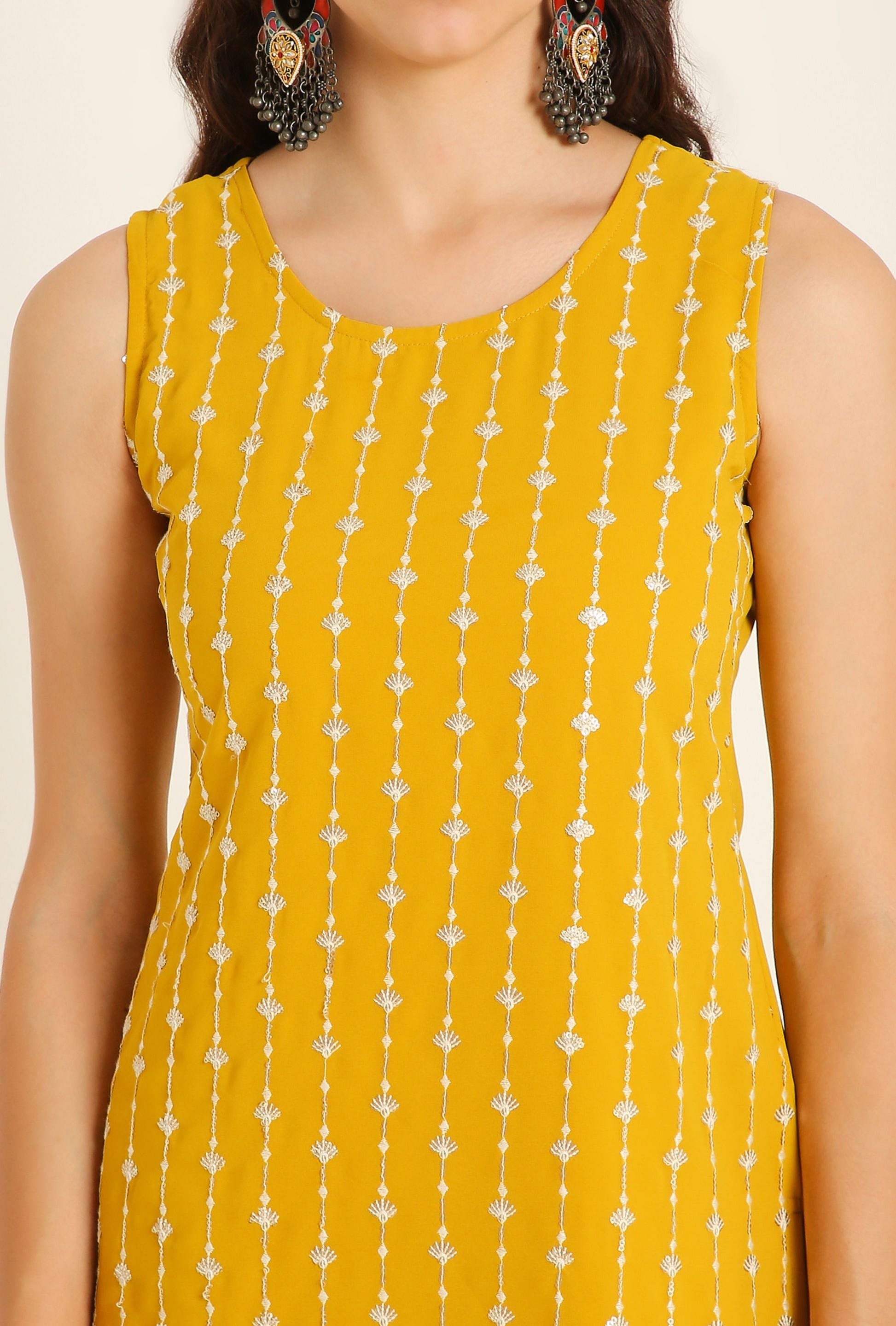 Elevate your wardrobe with our stunning embroidered georgette suit, featuring a chic kurta sharara set that’s perfect for any occasion. Crafted from lightweight georgette, the sleeveless straight kurta boasts a flattering round neckline and a sleek straight hemline, ensuring you look effortlessly stylish. The sharara comes with an elasticated waist for ultimate comfort, while the matching dupatta, adorned with playful tassels, ties the whole look together beautifully. Whether it’s a festive celebration or a casual outing, this ensemble is your go-to choice for a touch of elegance and charm.