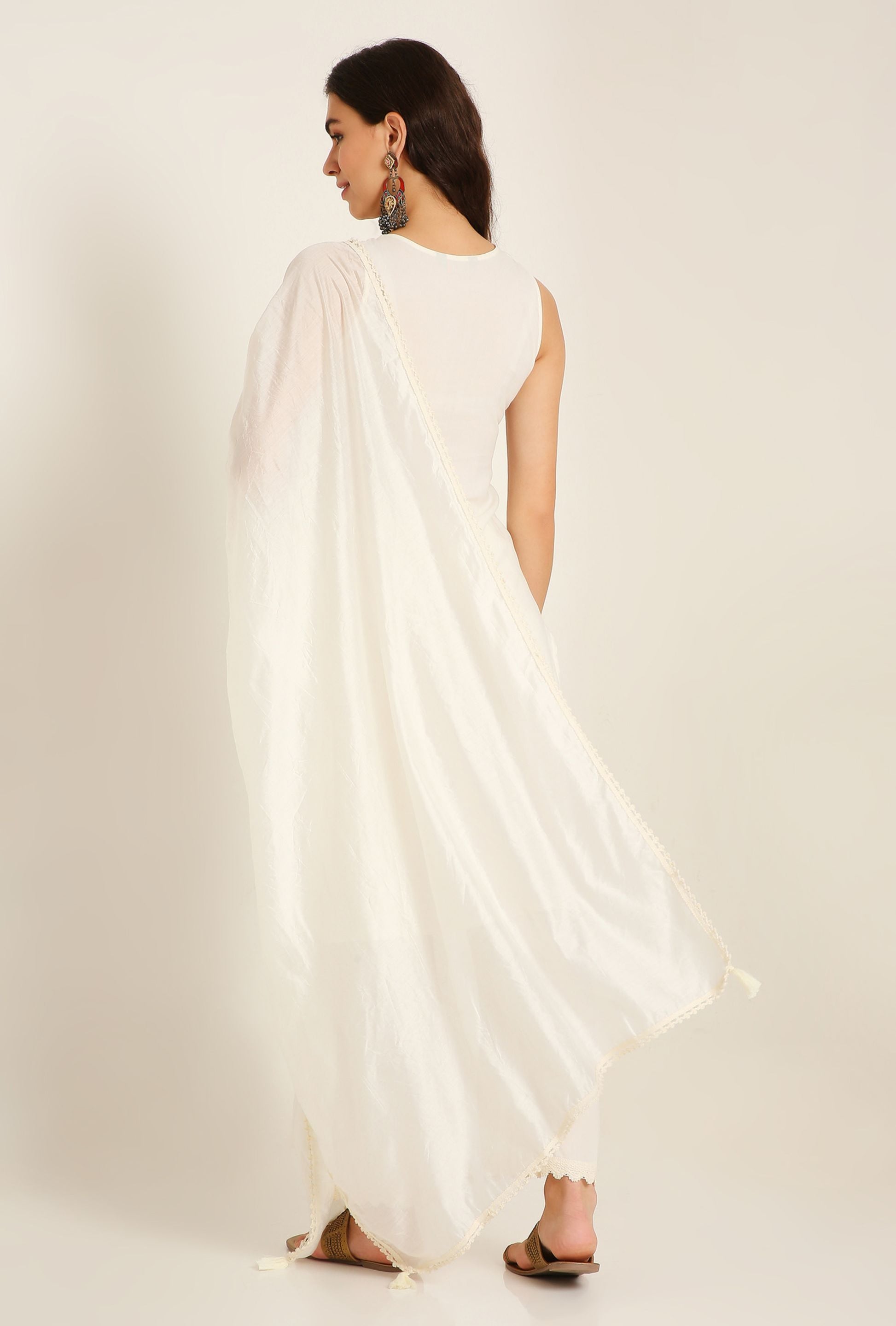 Elevate your ethnic wardrobe with our exquisite White Kurta Set. This knee-length kurta features intricate embroidery and sequinned ornamentation, adding a touch of elegance to your look. The straight shape and round neck design create a flattering silhouette, while the sleeveless style keeps you cool and stylish. Paired with solid palazzo pants that offer an elasticated waistband for a perfect fit, this ensemble is both chic and practical. Complete with a matching solid dupatta adorned with playful tassels, this kurta suit is perfect for festive occasions or casual gatherings. Embrace sophistication and grace with this stunning outfit.