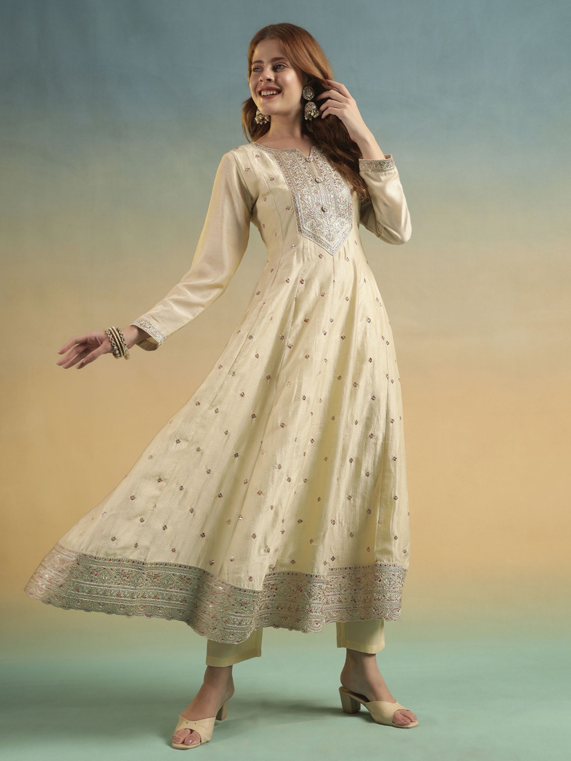 Pearl Cream Embroidered Silk Women's Kurta, Pyjama & Dupatta Set