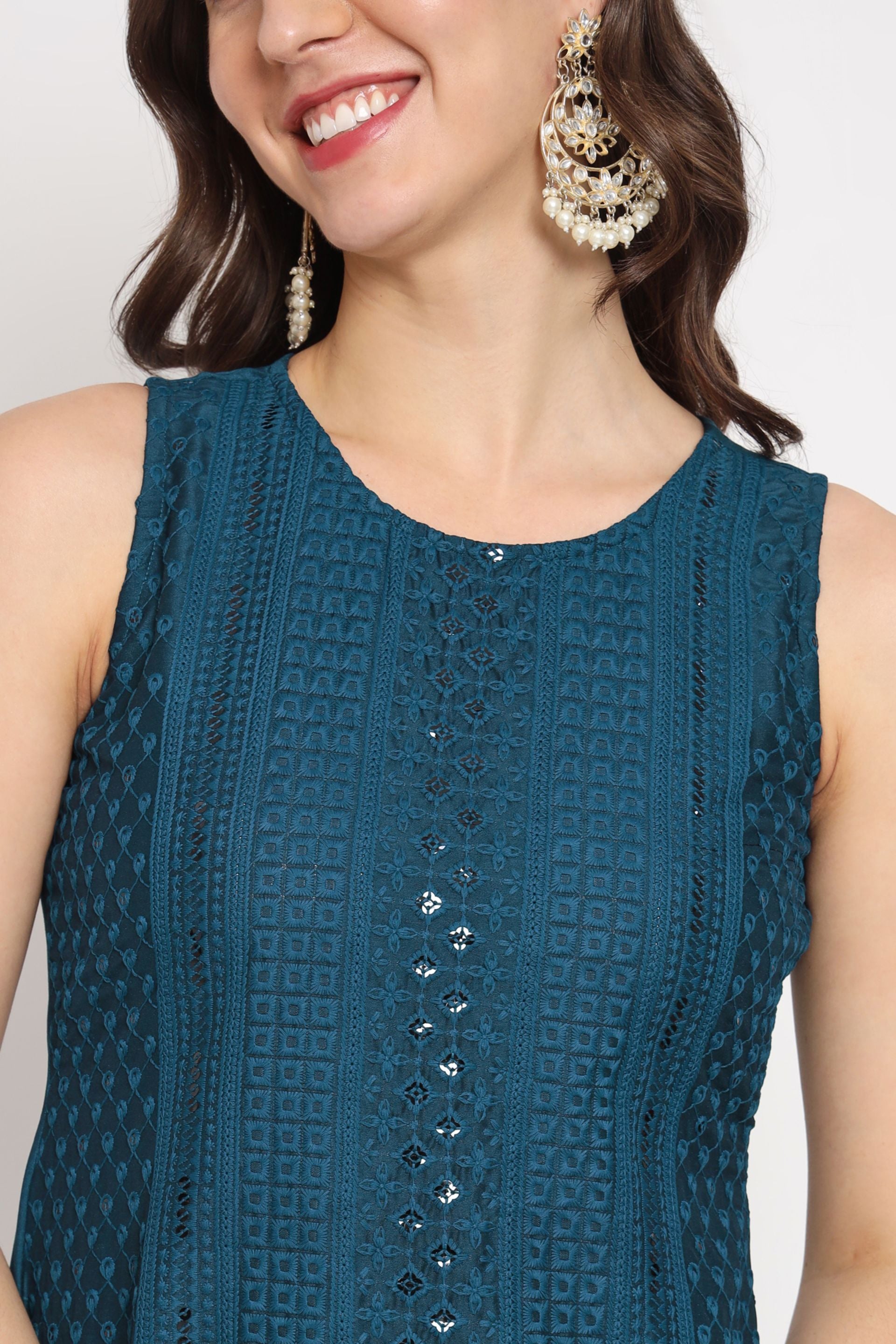 Elevate your party wardrobe with this stunning kurta set, designed to make a lasting impression. The calf-length kurta features exquisite embroidery and a round neck, complemented by sequinned ornamentation that adds a touch of glamour. Its straight shape and sleeveless design ensure a flattering fit, while the solid-patterned pants with an elasticated waistband provide comfort and ease of movement. Complete your look with the included solid dupatta, adorned with stylish tassels, perfect for draping or styling as you desire. This ensemble is not just a choice; it's a statement of elegance and sophistication for any festive occasion.
