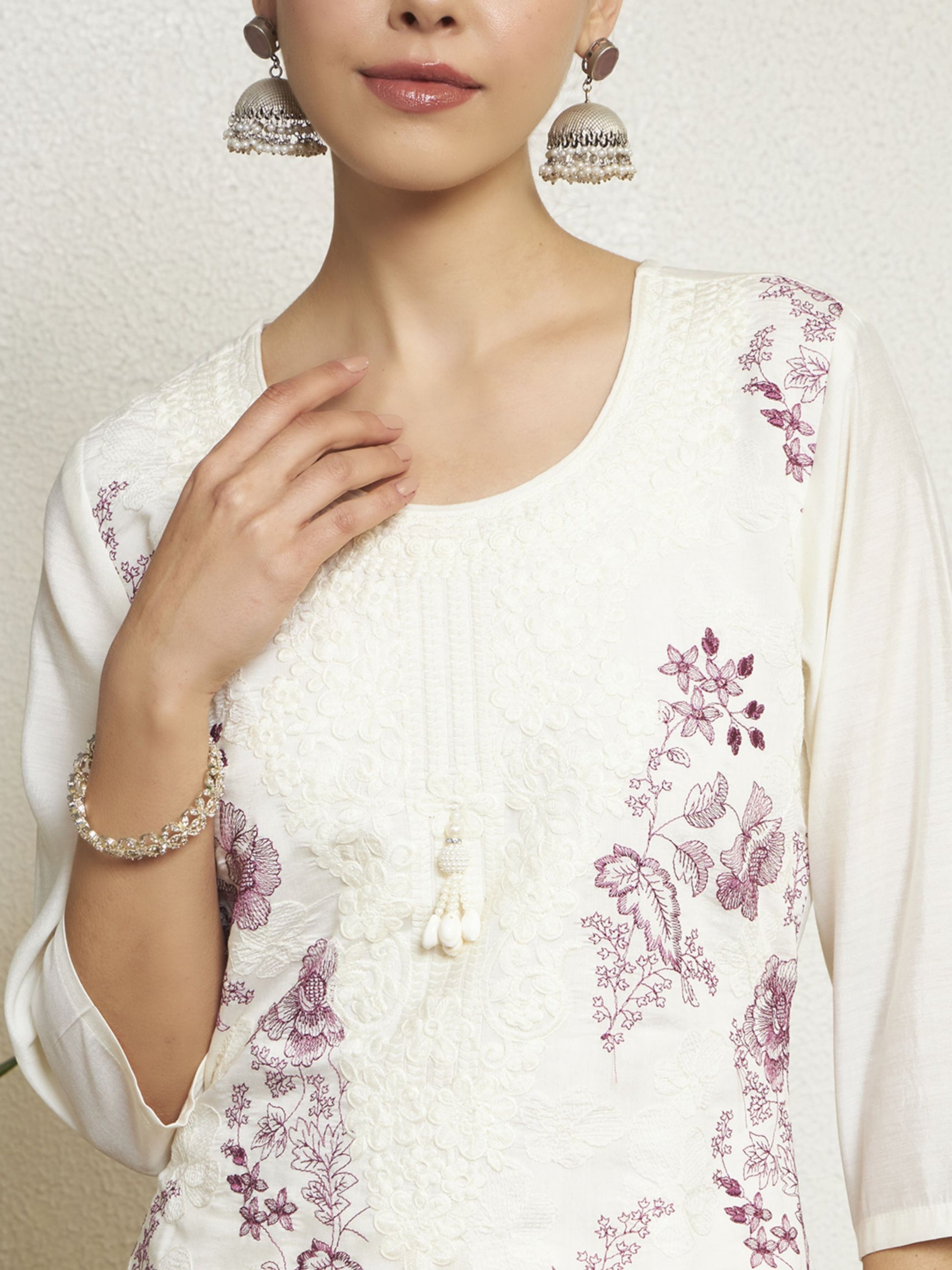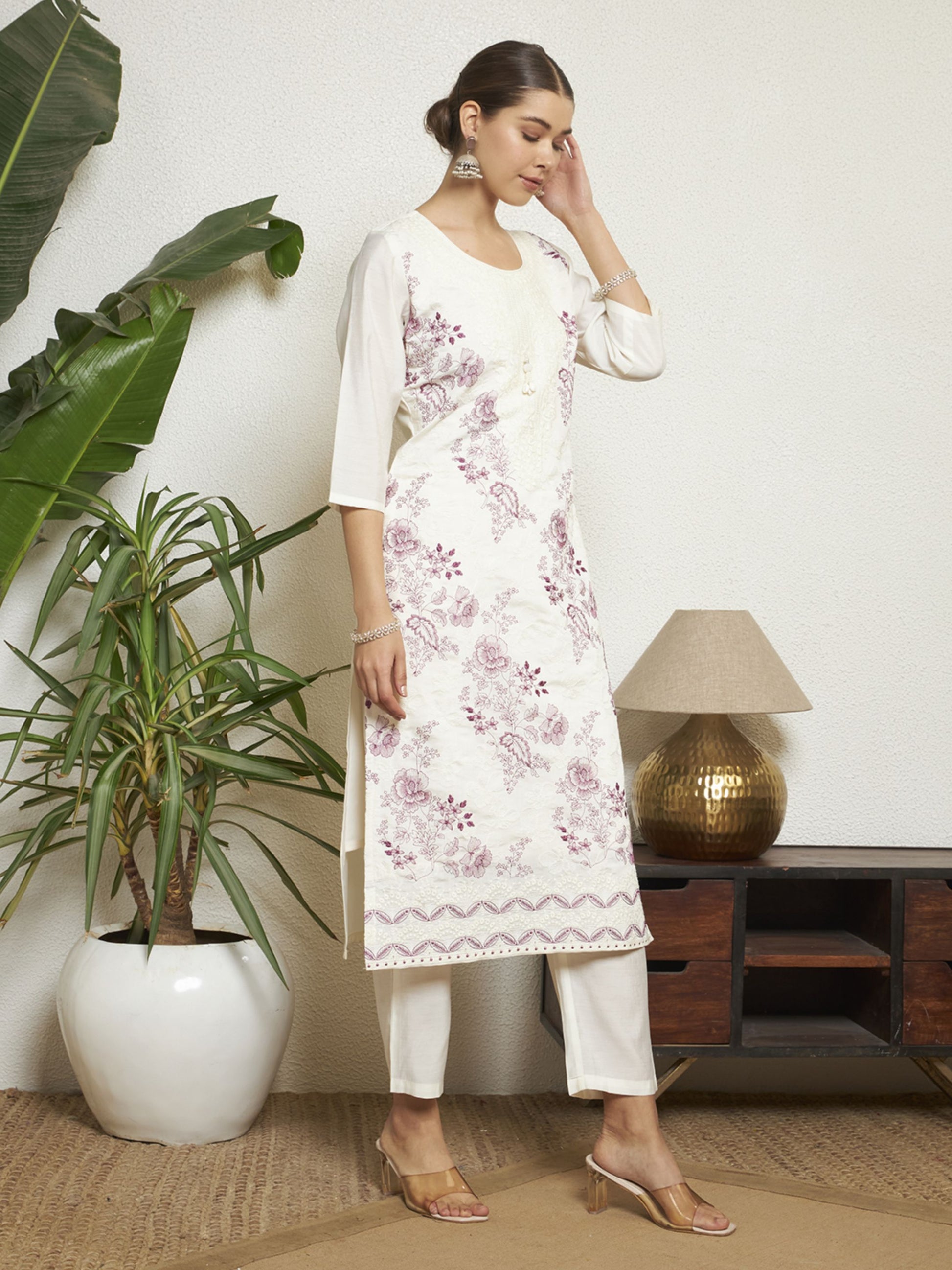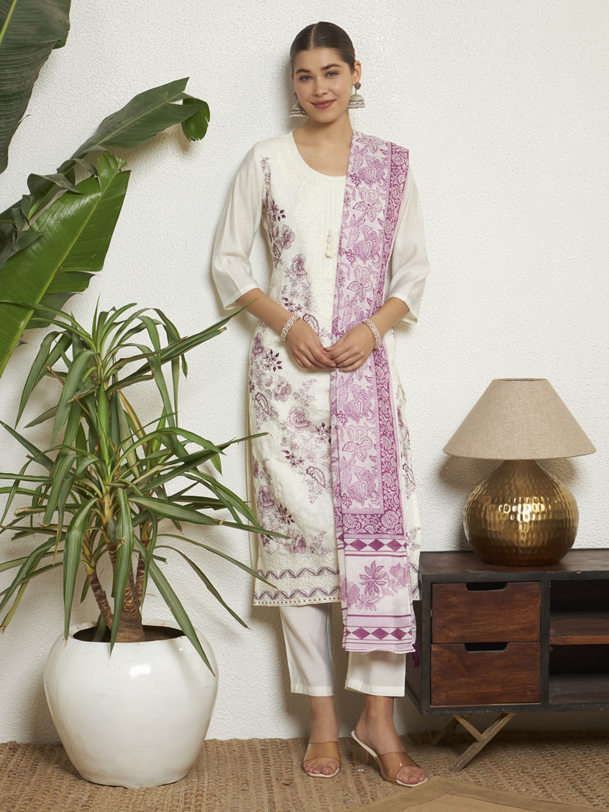 Elevate your ethnic wardrobe with this stunning kurta set, designed for elegance and comfort. The calf-length kurta features intricate embroidery and a flattering straight shape, complemented by a round neck and stylish 3/4 sleeves adorned with charming tassels. Paired with solid Pant comfortable slip-on fit with an elasticated waistband, this ensemble is perfect for any occasion. The included Printed dupatta, finished with tassels border, adds a touch of sophistication. This complete package contains one kurta, one pant, and one dupatta, making it a must-have for your collection.