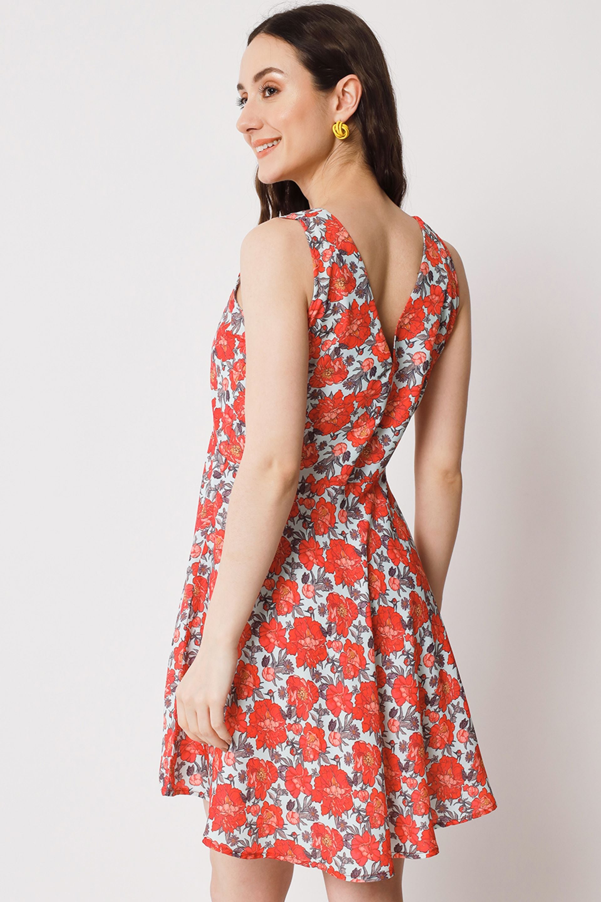 Elevate your wardrobe with our stunning floral skater dress, designed to make a statement at any occasion. this mini thigh-length dress features a flattering flared shape and a chic V-neckline, perfect for showcasing your favorite accessories. the sleeveless design ensures comfort and breathability, while the vibrant floral print adds a touch of femininity and charm. whether you're heading to a summer garden party or a casual brunch, this dress is the ideal choice for effortless style and elegance.