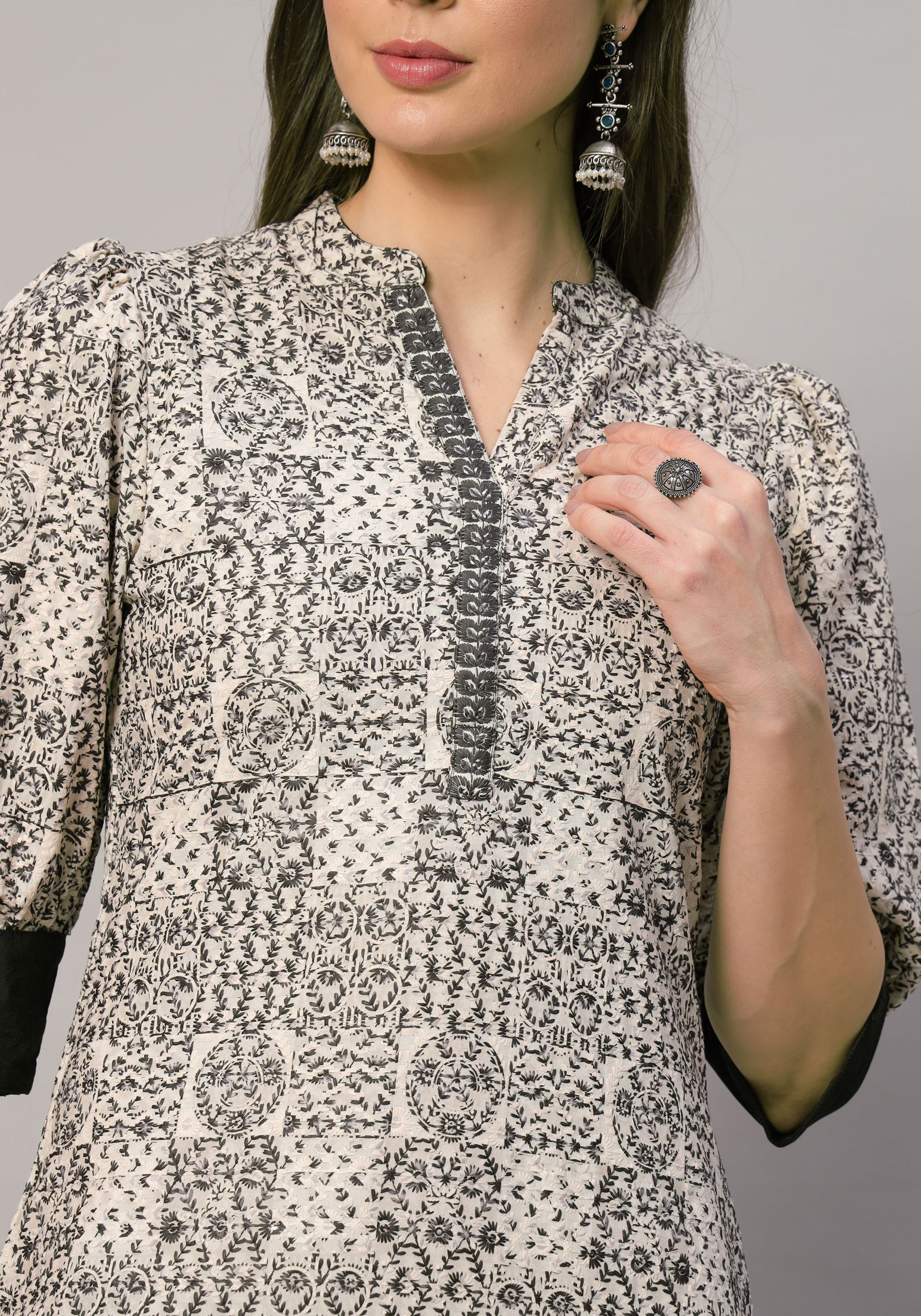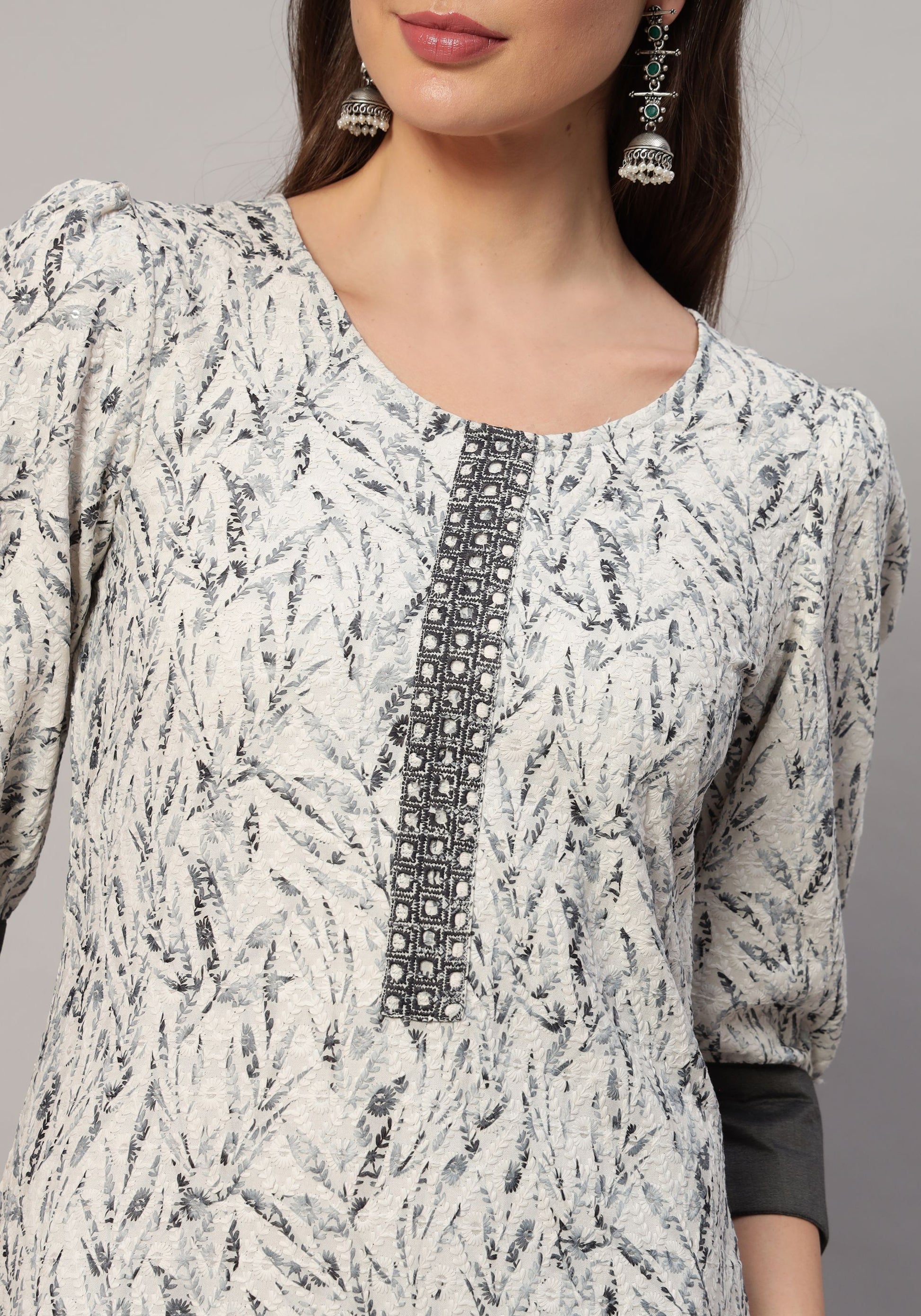 Elevate your ethnic wardrobe with this stunning printed suit, designed to make a statement. The knee-length kurta features exquisite embroidery, a flattering straight shape, and a comfortable V neck, complemented by elegant 3/4 sleeves. Paired with solid dhoti pants that offer a slip-on closure and an elasticated waistband for ease of wear, this ensemble ensures both style and comfort. The included solid dupatta, adorned with a plain border and delicate lace ornamentation, adds a touch of sophistication. Perfect for festive occasions or casual gatherings, this suit is a must-have for the modern woman who values elegance and grace.